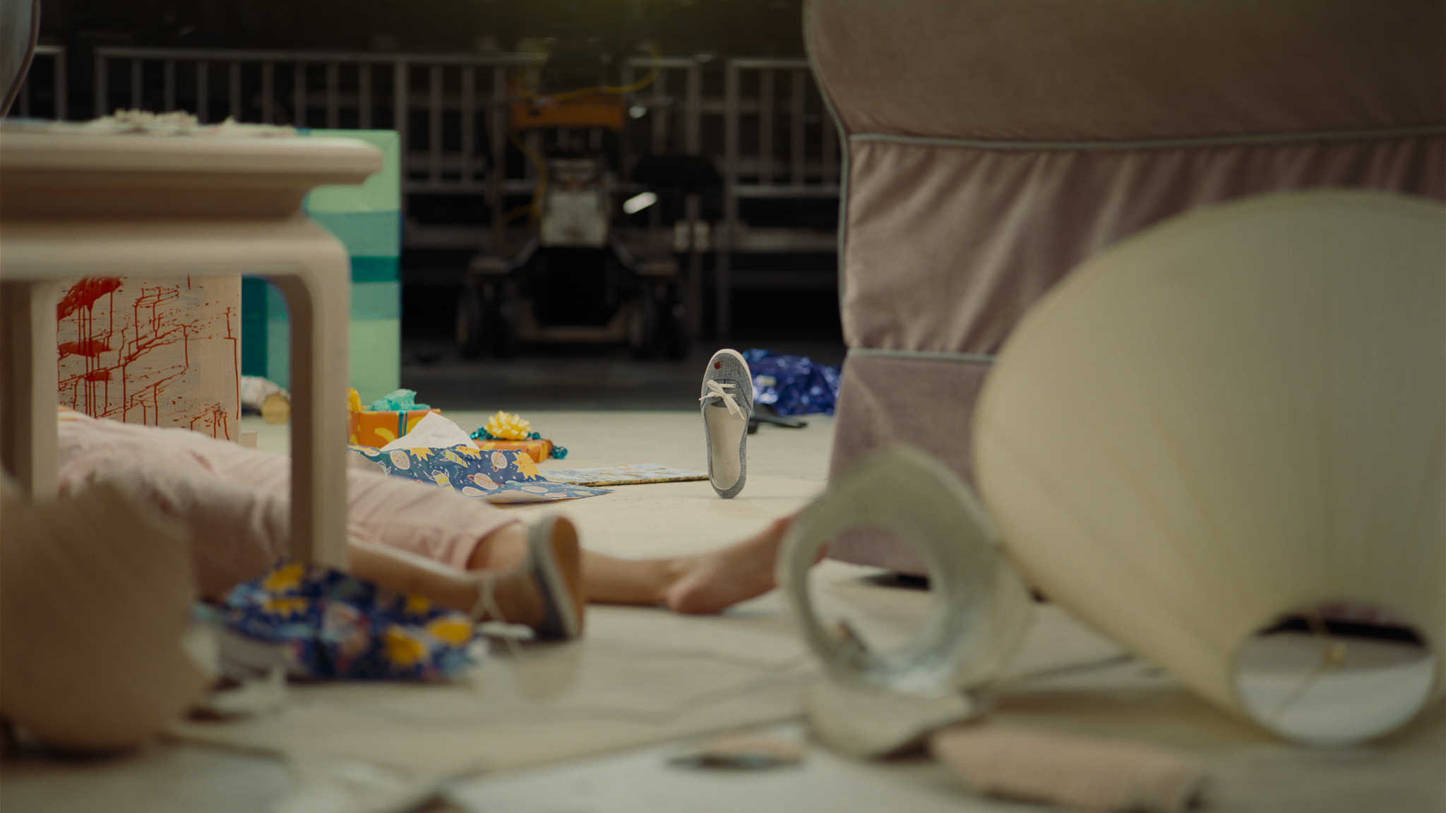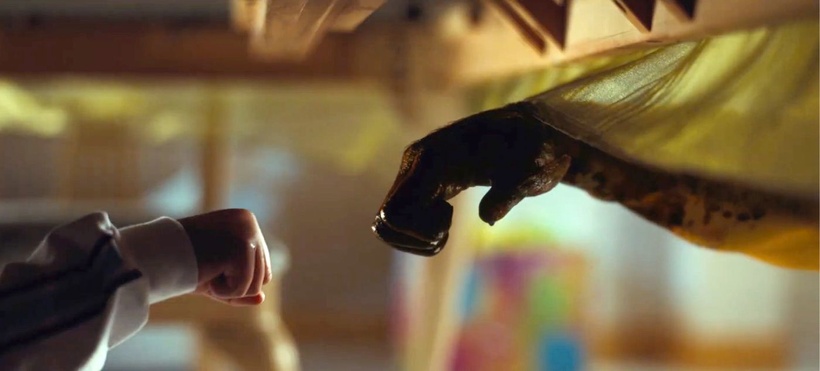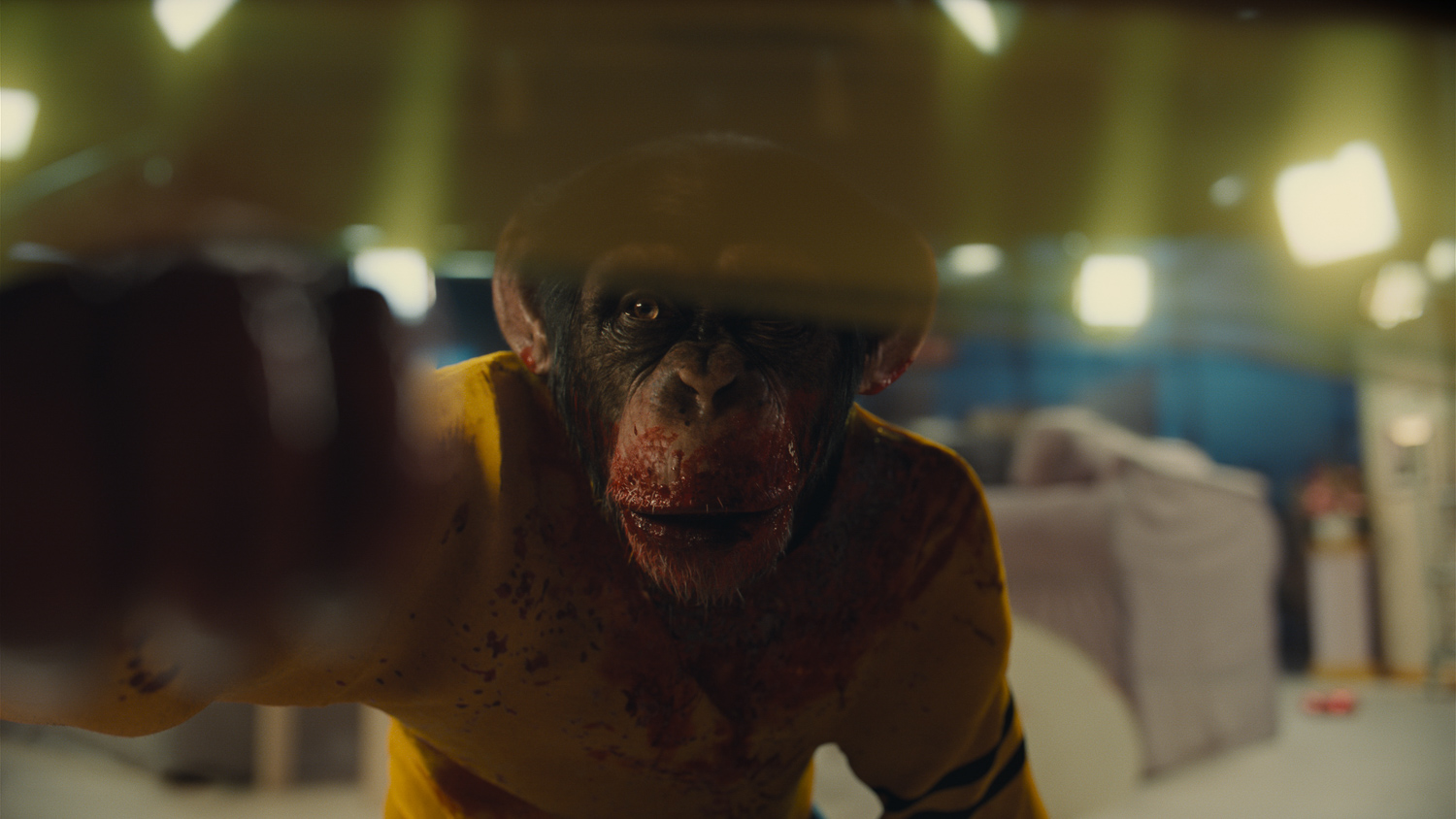 The film opens on a centered shot of a shoe, seemingly standing upright and marked by a splatter of blood. Ricky “Jupe” Park (Jacob Kim), a child actor, listens to the massacre around him on the set of TV show Gordy’s Home—a massacre doled out by the show’s resident chimpanzee as it attacks his co-stars. It’s a scene that functions as a framing device for the whole film, appearing in multiple flashbacks during key moments in each act, with unsettling visuals that mirror the horror of the alien in the film.